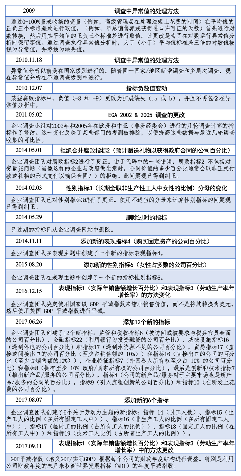 目前,世行發(fā)展經(jīng)濟(jì)學(xué)研究部的全球指標(biāo)小組(The World Bank Group-Global indicators Group in the Development Economics Vice-presidency,簡稱DECIG,ES的調(diào)查主體)正在更新企業(yè)調(diào)查計(jì)劃,調(diào)查計(jì)劃的調(diào)整變化如表3所示。該計(jì)劃是一個(gè)重要的附加計(jì)劃,是BEE項(xiàng)目所需的企業(yè)層面數(shù)據(jù)來源。為反映不同經(jīng)濟(jì)體的營商環(huán)境情況,在原有210個(gè)核心指標(biāo)基礎(chǔ)上(具體參見ENTERPRISE SURVEYS INDICATOR DESCRIPTIONS,January 30, 2023),企業(yè)調(diào)查計(jì)劃新增60個(gè)指標(biāo)(最多可增加60個(gè)指標(biāo)),其中50個(gè)指標(biāo)專門用于收集數(shù)據(jù),直接用于BEE項(xiàng)目[9]。