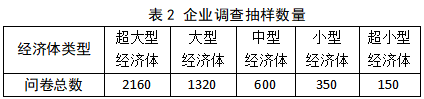 行業分層:企業調查覆蓋全部制造業和全部服務業,包括所有制造業、建筑業、批發零售業、交通運輸業和倉儲業、酒店和住宿業、信息傳輸業、律所會計師等科技服務業、維修行業。農業、開采業和銀行業不在企業調查范圍之內。 規模分層:企業規模將覆蓋大型企業、中型企業、小型企業。 (三)抽樣數量 每個分層中將抽取具有代表性的樣本,每個區域的抽樣數量并非固定,六個區域內也非均勻分布,對于某些產業活動單位數目較多的省份,將會通過調整權重方式進行校正。不同的經濟體的總樣本數如表2所示。中國作為超大型經濟體的總體樣本數是2160份。