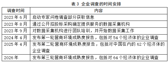 (四)調查過程 調查開展前,世行將對第三方調查機構進行系統科學的培訓,調查實施時將邀請被調查企業的高管、股東,或者人力資源總監和財務總監等專業人員對問卷進行作答,如出現無效作答或者回答矛盾等問題,將通過反復溝通,重新訪談、填答的方式以保證問卷結果的真實性和科學性。詳細時間安排見表3。