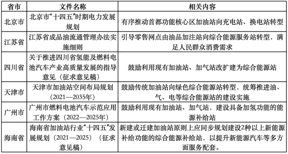 新能源汽車成為交通領域落實“雙碳”戰略和保障國家能源安全的重要抓手,國家發展改革委、國家能源局《關于完善能源綠色低碳轉型體制機制和政策措施的意見》《關于加快推進充電基礎設施建設 更好支持新能源汽車下鄉和鄉村振興的實施意見》等文件及北京、江蘇、四川、天津、廣州等地,均鼓勵傳統加油站、加氣站建設綜合能源站。同時,北京市發布《北京市加油站設置新能源設施安全生產管理工作指引》,率先明確加油站設置充換電設施的安全技術要求。