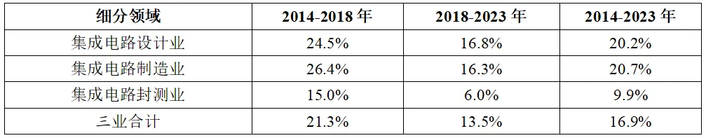 表2 2014-2023年我國集成電路產業三大主業銷售收入年均復合增速情況
