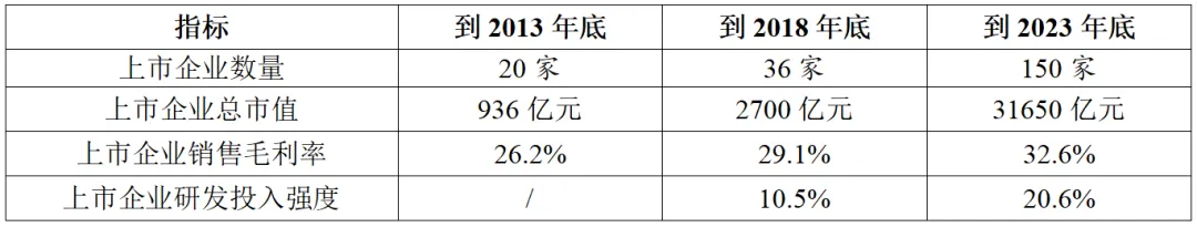 資本市場助力產業升級,上市企業數量質量雙飛躍。根據東方財富金融數據統計(表4),截止到2013年底,我國實現A股上市的半導體企業僅有20家,總市值不足千億元,平均銷售毛利率26.2%。而到2023年底,上市企業數量超過150家,總市值超過3萬億元,平均銷售毛利率32.6%。尤其是2018-2023年,由于科創板的設立,帶動集成電路產業在資本市場實現“加速跑”,5年間上市企業數量和總市值分別實現超過4倍和10倍的增長,上市企業平均銷售毛利率和研發投入強度也實現大幅躍升。