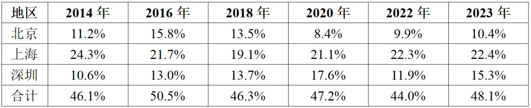 表6 2014-2023年北京、上海、深圳集成電路設計、制造、封測三大主業銷售收入占全國比重情況