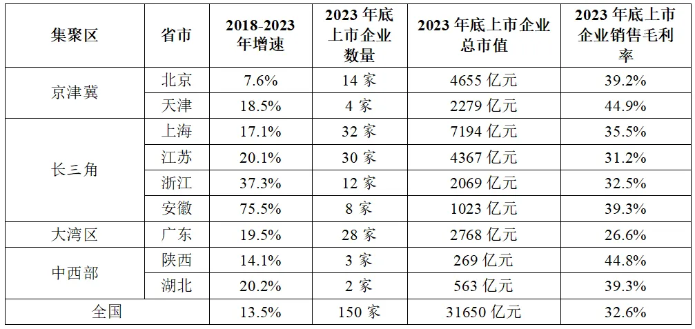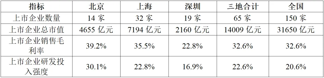 在企業發展方面,北京上市企業發展質量最高,上海上市企業數量和總市值最多。根據東方財富數據(表7),截止到2023年底,北京、上海、深圳分別擁有14家、32家、19家半導體領域的上市企業,總市值分別為4655億元、7194億元、2160億元,合計上市企業數量和總市值占到全國的40%以上。其中上海上市企業的數量和總市值最多,而北京的上市企業發展質量最高,銷售毛利率和研發投入強度分別達到39.2%和30.1%,遠超全國平均水平。