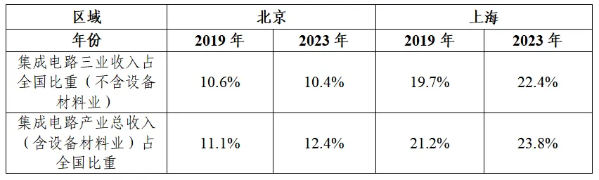 表1 2019年和2023年北京、上海的集成電路產業規模占全國比重的對比(億元)