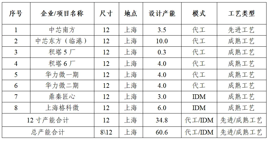 表7 上海集成電路12寸產能和總產能情況(萬片)