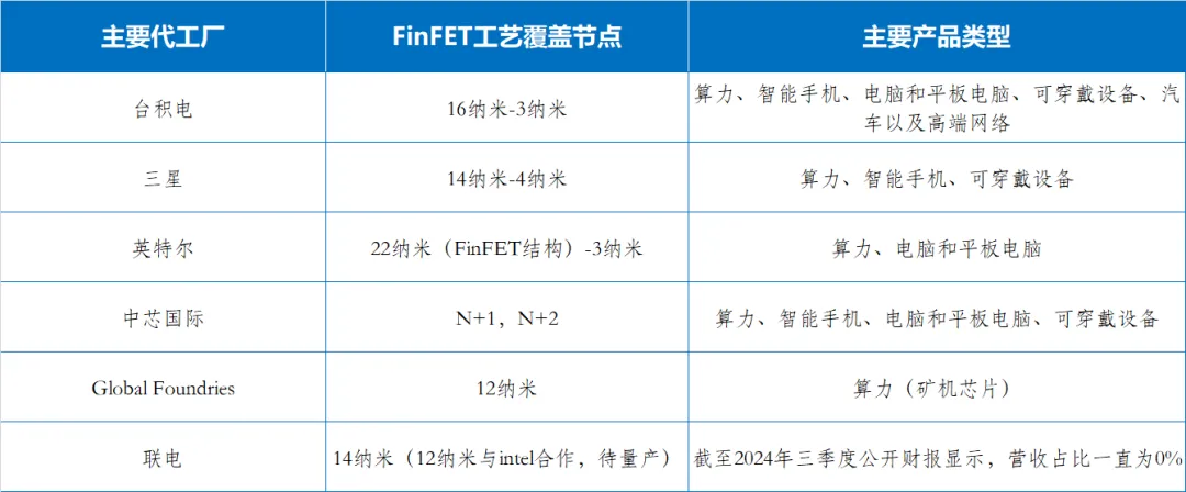 表1 全球主要代工廠FinFET工藝覆蓋節點和主要產品