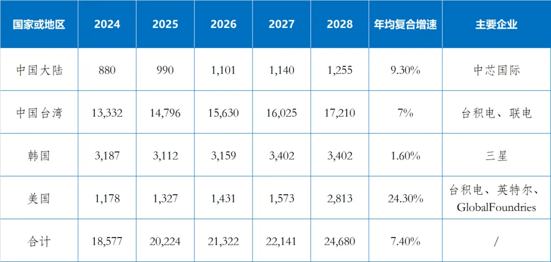 表2 2025-2028年全球FinFET工藝分布及所在區域的主要企業(等效8英寸晶圓月產能/千片)