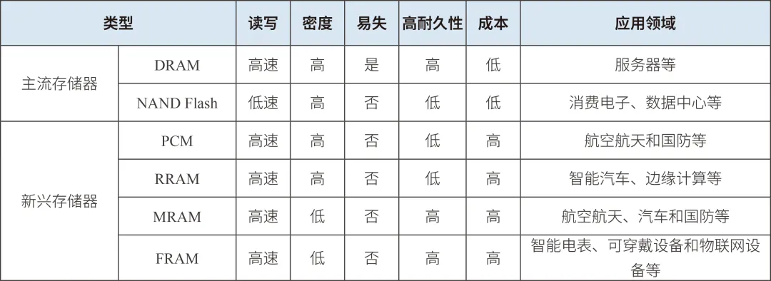 目前,PCM、RRAM、MRAM、FRAM等新興存儲(chǔ)技術(shù)已從實(shí)驗(yàn)室研究階段逐步邁向?qū)嶋H應(yīng)用和產(chǎn)業(yè)化,取得了一系列技術(shù)突破,并實(shí)現(xiàn)部分成果的轉(zhuǎn)化落地。各類新興存儲(chǔ)技術(shù)在具有低功耗、非易失性、高速讀寫(xiě)及兼容CMOS工藝等共有優(yōu)勢(shì)下,也因其獨(dú)特特性,應(yīng)用于不同領(lǐng)域。其中,PCM因具備有效抗輻照性能,被應(yīng)用于航空航天和國(guó)防等領(lǐng)域,但也因存儲(chǔ)密度過(guò)低、成本高、良率低,以及無(wú)法應(yīng)用于寬溫場(chǎng)景等劣勢(shì),尚未大規(guī)模產(chǎn)業(yè)化。RRAM因耐久性強(qiáng)和具備多位存儲(chǔ)能力,適用于智能汽車、邊緣計(jì)算等對(duì)高性能、低功耗、小型化、高密度、可嵌入方面需求較強(qiáng)的終端領(lǐng)域。MRAM因高集成度和抗輻射能力在航空航天、國(guó)防等領(lǐng)域應(yīng)用潛力突出。FRAM在具備高可靠性等技術(shù)優(yōu)勢(shì)的同時(shí),也面臨制造成本較高且成品率低的挑戰(zhàn),因此適用于對(duì)讀寫(xiě)速度和頻率要求高,但容量要求不高、使用壽命要求長(zhǎng)的場(chǎng)景。