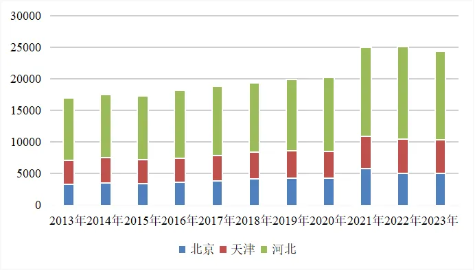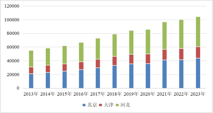 圖1 京津冀2013-2023年地區(qū)生產(chǎn)總值(億元)1