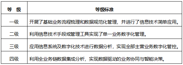 202210月,工業和信息化部發布了《中小企業數字化水平評測指標》,從數字化基礎、經營、管理和成效四個維度評估中小企業數字化水平,將數字化水平劃分為四個等級[1](表1)。