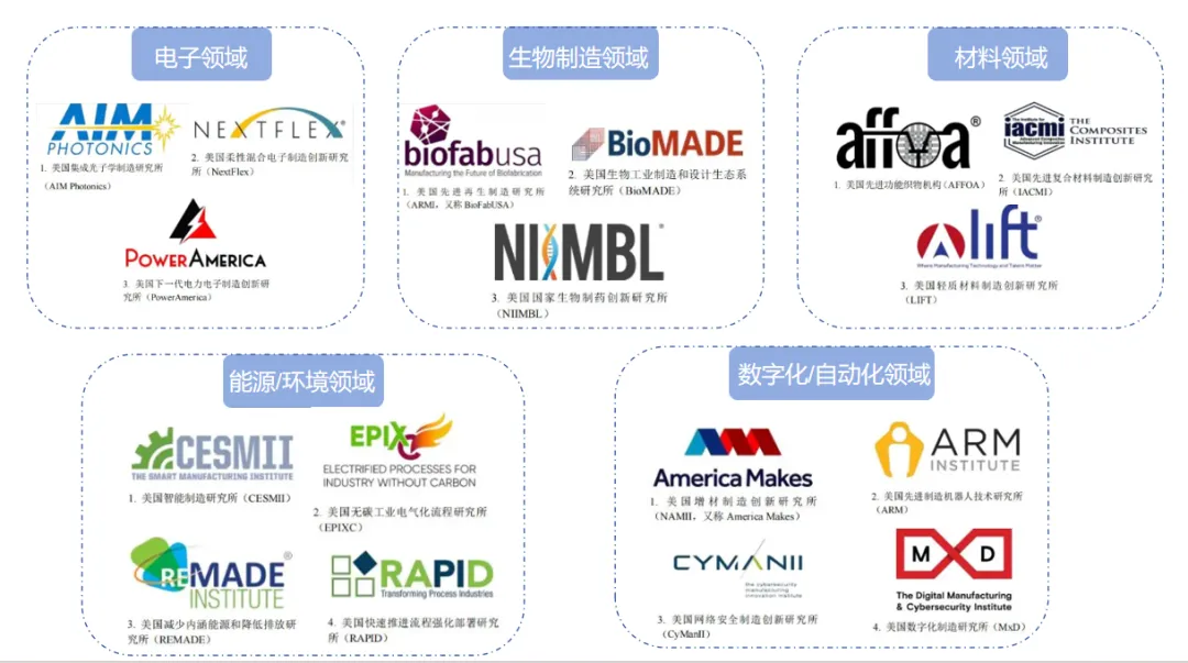 2012年美國計劃通過建立15個制造業(yè)創(chuàng)新研究所,打造覆蓋全美的制造業(yè)創(chuàng)新網(wǎng)絡。截至2023年11月,美國已設立17個制造業(yè)創(chuàng)新研究所,覆蓋電子、材料、能源/環(huán)境、數(shù)字化/自動化、生物制造領域。