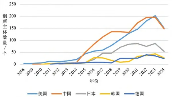 創(chuàng)新主體數(shù)量看,整體呈“階梯式躍升-增速回調(diào)”特征,中美平分秋色。2008—2013年為技術(shù)萌芽期,年均新增主體不足15家;2014年起隨資本涌入與技術(shù)成熟度提升進(jìn)入爆發(fā)增長期(2014—2017年CAGR達(dá)63.8%),2017年突破300家;2018—2023年增速趨緩但仍維持高位(CAGR 15.8%),2023年達(dá)到782家的峰值。2024年創(chuàng)新主體數(shù)量首次出現(xiàn)負(fù)增長,預(yù)示行業(yè)進(jìn)入技術(shù)路線收斂、市場出清與頭部集中化的關(guān)鍵調(diào)整期,從“野蠻生長”轉(zhuǎn)向“高質(zhì)量發(fā)展”階段(圖3)。從各國看,自2014年起,我國創(chuàng)新主體數(shù)量快速增長,連續(xù)多年領(lǐng)跑全球。美國作為eVTOL領(lǐng)域研究的先行者,其創(chuàng)新主體規(guī)模保持穩(wěn)定高增長態(tài)勢(shì),憑借技術(shù)先發(fā)優(yōu)勢(shì)持續(xù)鞏固全球主導(dǎo)地位。日本、韓國和德國的創(chuàng)新主體數(shù)量雖維持增長態(tài)勢(shì),但受限于市場規(guī)模和產(chǎn)業(yè)水平,與中美兩國的總量差距持續(xù)擴(kuò)大,eVTOL產(chǎn)業(yè)的發(fā)展?jié)摿﹄y以與中美兩國相比較(圖4)。