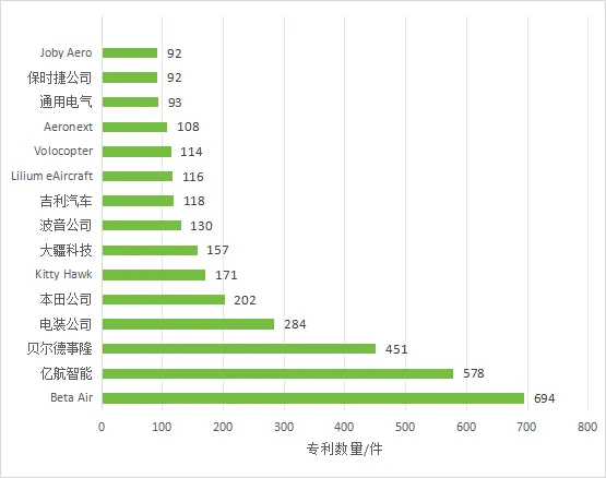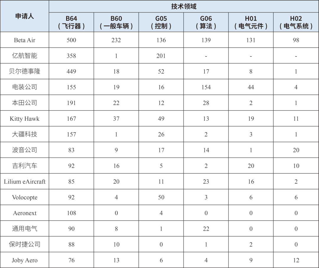 表1 全球重點(diǎn)申請(qǐng)人eVTOL領(lǐng)域?qū)@夹g(shù)布局(單位:件)