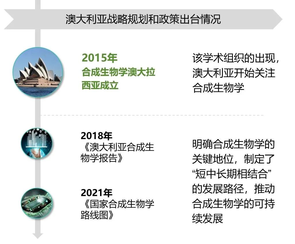 澳大利亞已將合成生物學確定為具有戰略重要性的關鍵技術,聚焦食品農業、健康醫藥、以及環境、化學、材料、燃料等領域,支持布局建設大量的前沿基礎設施,加速合成生物學應用的轉化和商業化。2021年發布的《國家合成生物學路線圖》,明確了未來20年內澳大利亞合成生物學“短中長期”的發展路徑。