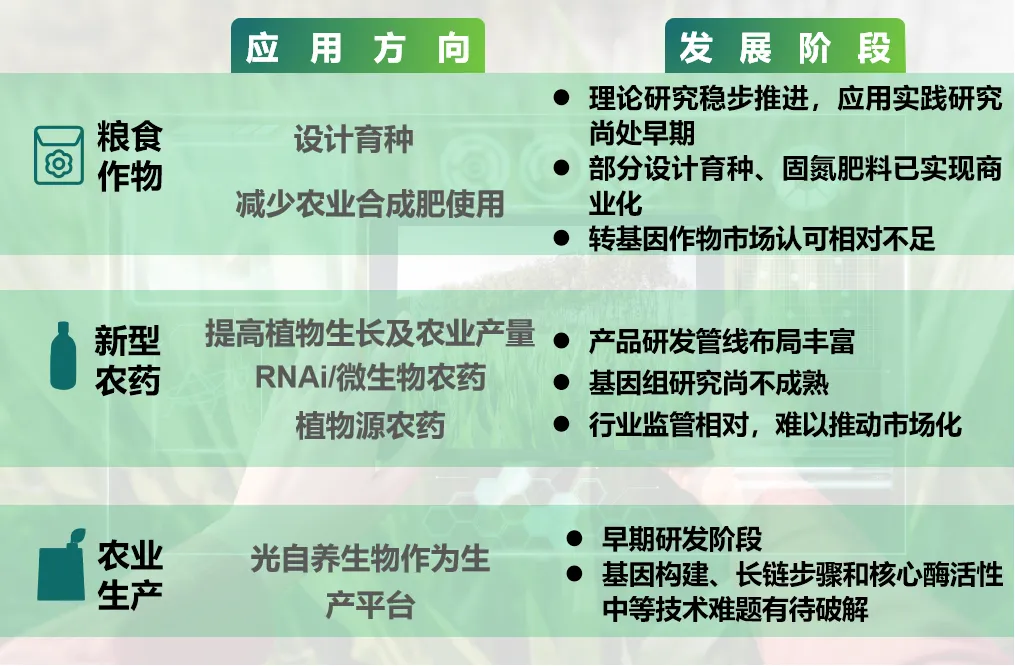 圖2 合成生物技術農業應用方向及發展階段