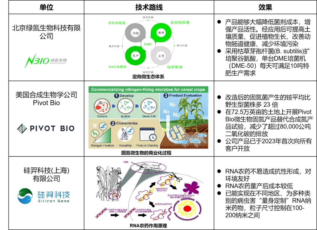 合成生物學技術與農業領域的結合日益緊密,并在部分方向上已有商業化成果。目前,農業合成生物學的基礎研究主要集中在人工細胞合成、細胞工廠、種質改良、二氧化碳固定、生物固氮和農業環境優化等方面,應用研究主要集中在植物天然產物開發、農作物性狀改良、病蟲害防控、肥料生產、飼料及添加劑制備等方面,目前能夠或接近實現商業化的應用主要集中在作物育種、固氮肥料、農藥生物制造等領域。相比之下,生物固碳、生物固氮和代謝途徑改造等仍處于初期概念階段。