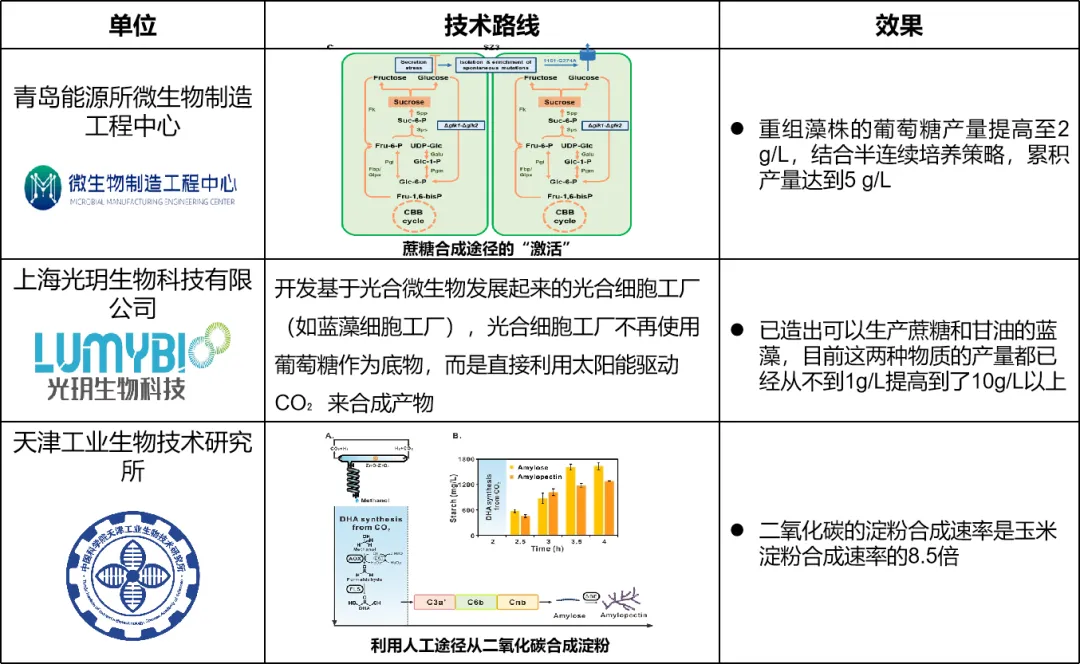 目前國內已有團隊在該領域取得研究進展,如青島能源所微生物制造工程中心實現藍細菌直接利用二氧化碳合成葡萄糖;上海光玥生物科技有限公司改造出可以生產蔗糖和甘油的藍藻;天津工業生物技術研究所成功實現從二氧化碳到淀粉的人工合成,但基本都還處于實驗室概念驗證階段。