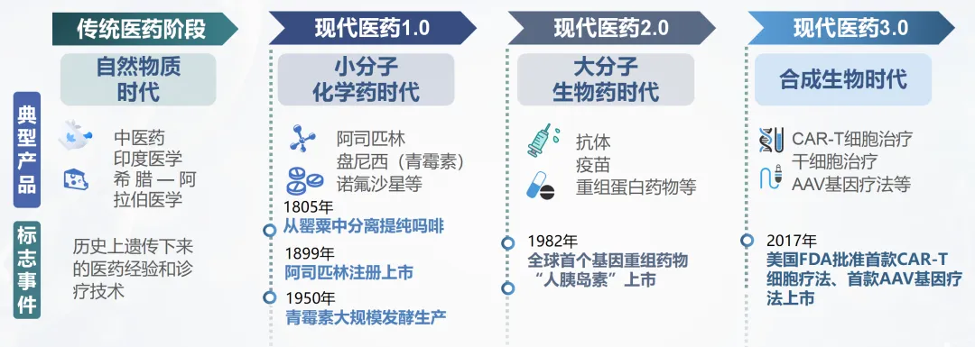 在生命科學技術加速演進的驅動下,醫療健康產業經歷了從傳統到現代、從經驗到科學的四個階段的演變過程,當前已經進入現代醫藥3.0時代。隨著高通量基因測序、CRISPR-Cas基因編輯等技術的快速更新迭代,合成生物這把探索生命奧秘的新鑰匙,與醫療健康的融合更加緊密,實現了從“造物致知”到“造物致用”的進階式發展。