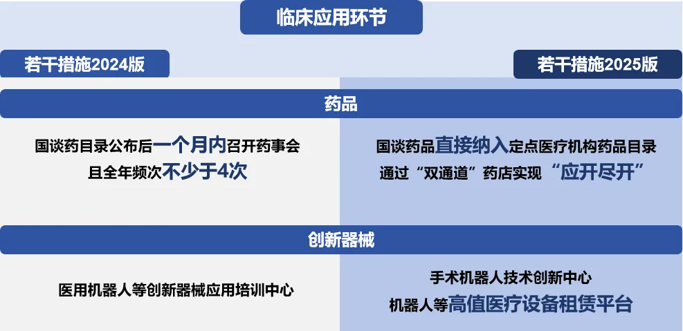 創(chuàng)新藥方面,相較于上海、廣東等地增加召開藥事會頻次,北京率先提出國談藥可直接納入全市定點醫(yī)療機(jī)構(gòu)藥品目錄,無需召開藥事會,醫(yī)療機(jī)構(gòu)可通過“雙通道”藥店實現(xiàn)“應(yīng)開盡開”。此外,支持醫(yī)療機(jī)構(gòu)針對創(chuàng)新價值高但臨床數(shù)據(jù)較少、實際證據(jù)不充分的藥物開展真實世界研究,驗證藥物臨床價值。創(chuàng)新醫(yī)療器械方面,搭建機(jī)器人等高值醫(yī)療設(shè)備租賃平臺,運(yùn)用市場化方式打通創(chuàng)新醫(yī)療器械入院“最后一公里”,破解創(chuàng)新醫(yī)療器械高成本與推廣難的矛盾,加快手術(shù)機(jī)器人入院應(yīng)用和創(chuàng)新迭代。